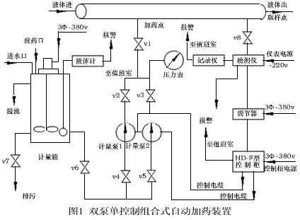 本裝置由二個計量箱、三臺計量泵、三套交流變頻式自動加藥控制系統(tǒng)、連接管路、閥門、底座等組成見圖2